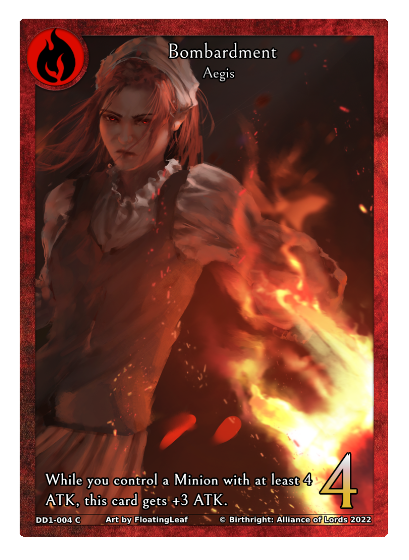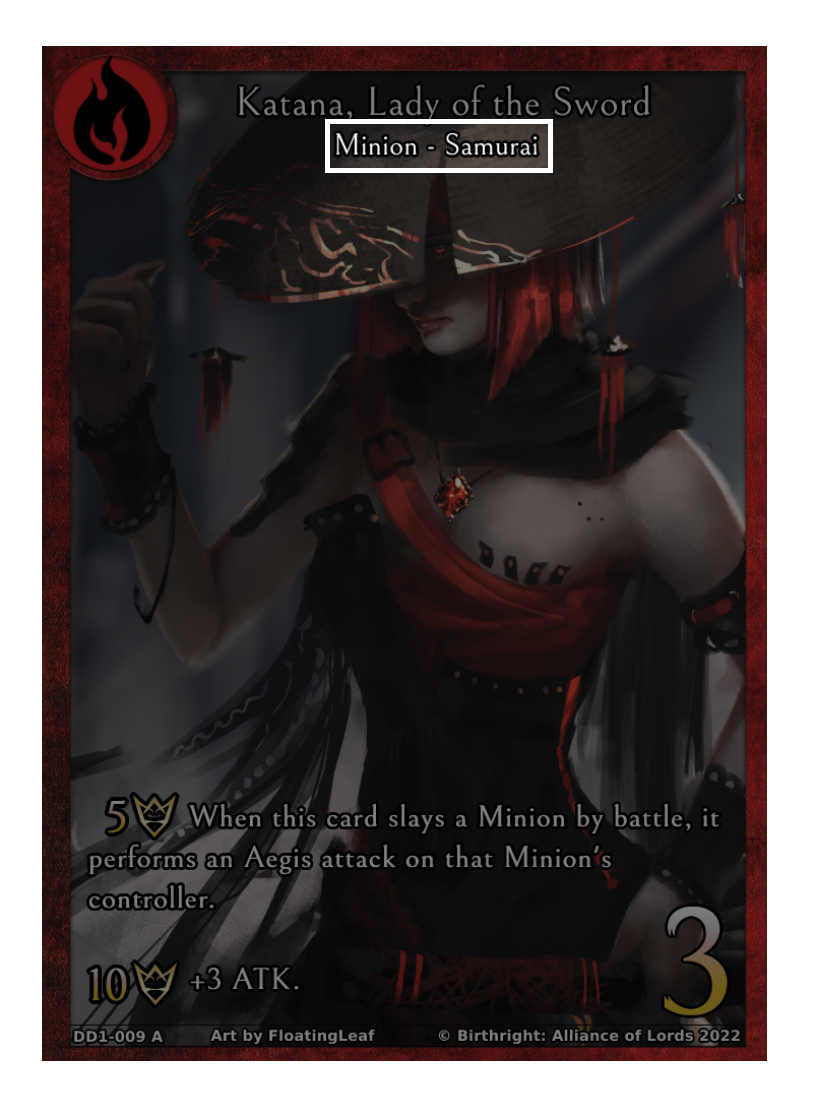 A card’s ATK indicates its strength in combat. ATK values are used to determine what is slain during combat between Minions or Aegises. A card with 0 ATK cannot exist on the field and is automatically slain.